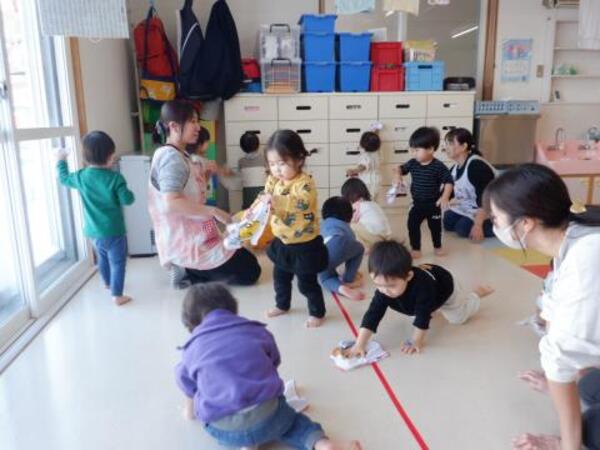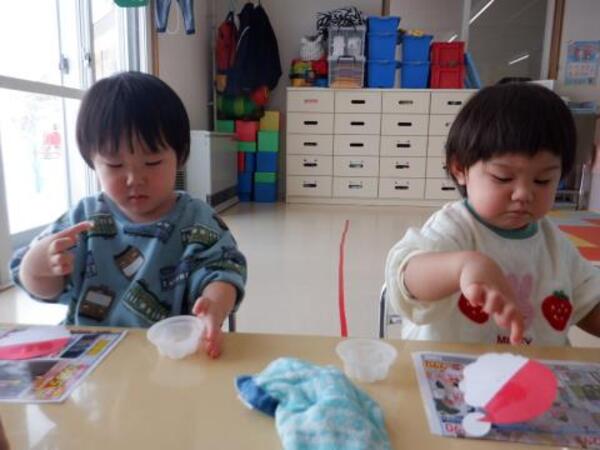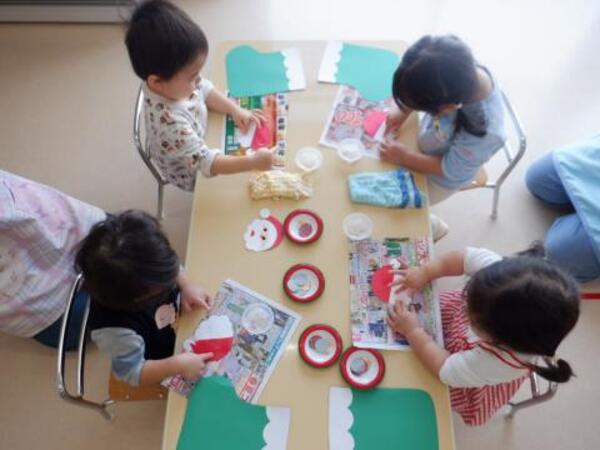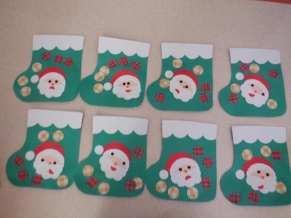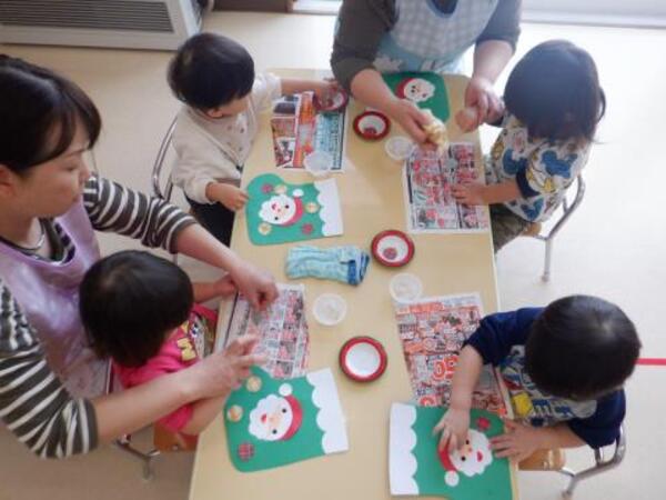 | 12月22日 月曜日 ちゅうりっぷさんは、お部屋でクリスマス製作をしましたよ。 初めて、のり付けにチャレンジです。 くつしたに、サンタさんと、丸いお飾りをのり付けしました。 小さな指で、のりをすくって、上手にぬりぬりして、 のりの感触も楽しんでいましたよ。 かわいいくつしたサンタの出来上がり〜♪ |
