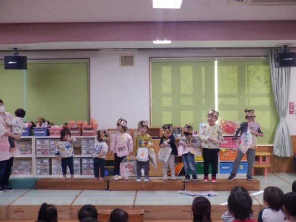 | 12月19日 金曜日 今日は12月のお友達のお誕生会 キラキラかんむりを被って 9人のお友達がステージへ それぞれのお友達がドキドキ♡しながら インタビューを受けていました。 出しものは お遊戯会の踊り♬ 各クラスのお友達がステージに上がって 踊りを披露! ももさんもちゅうりっぷさんもたんぽぽさんも 上手に踊っていましたよ |