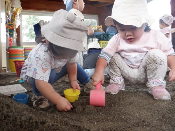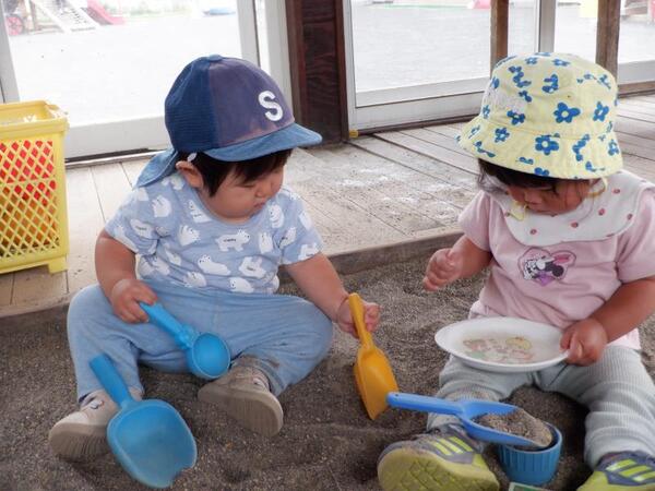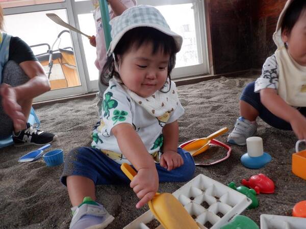 | 9月17日 水曜日 ももさんは、初砂遊びです。 この、さらさらは何? ちょっと気持ちいいね。 これ、コップに入れるの?スコップで? みんなで楽しく遊ぶことが出来たももさんです。 |