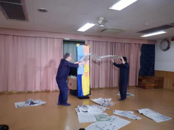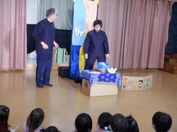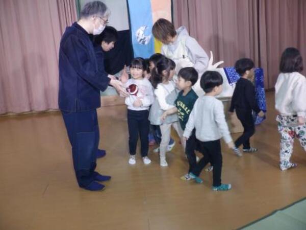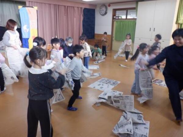 観劇 劇団風の子 2月2日 月曜日今日は、お楽しみの観劇の日です。劇団風の子さんが来園してくれました。新聞紙あそびや、袋あそびを、たくさん見せてくれて『山を越え、川を越え、きたかぜのおくりもの』という劇を観ました。みんな、よろこんで声を出したり、拍手をしたり楽しい時間を過ごしましたよ。ゆりさんは、観劇のあと、お遊戯室で劇団の方々と新聞紙あそびをしましたよ。面白かったね〜‼ 2026/02/02