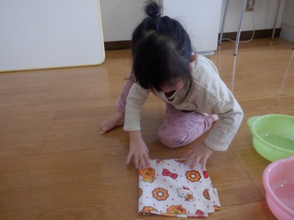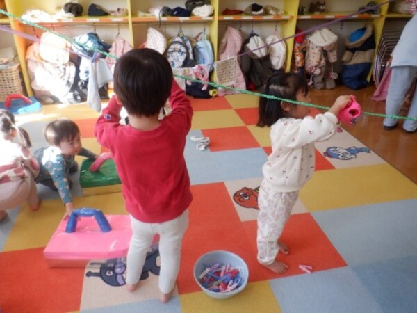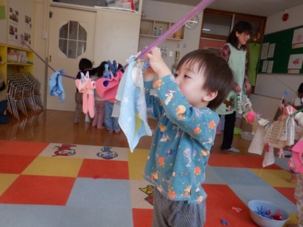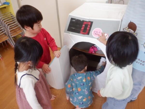 たんぽぽさん「せんたくごっこ」 2月6日 金曜日たんぽぽさんはお部屋で「せんたくごっこ」洗濯物を大きな洗濯機に入れて・・スイッチ オン!!グルグル回るよ〜洗濯機ピピピピ〜! 洗濯終了洗濯物を干して 乾かしてどうやって 干そうかな?こうかな?洗濯ばさみでパッチン!アイロンかけてゴシゴシゴシ・・・大忙しのたんぽぽさんの洗濯屋さんでした。 2026/02/06